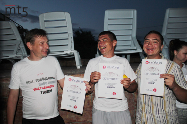 Тут настало время представителям компании InstaForex раздавать призы и подарки участникам. После тяжелейших каверзных вопросов были выявлены самые внимательные форумяне, которые удостоились ценных призов. За лучший костюм Дикого Запада была награждена Гелька сертификатом с номиналом в 100$, также за бесспорную победу в чемпионате по настольному теннису сертификат получил Вадим Громов, а вот в бильярде не все так просто, поэтому пьедестал разделили сразу двое спортсменов — shark776 и Станислав82, которые также были удостоены сертификатов, и последний бонус ушел Сергею Казакову за непредвзятое судейство. Герои вечера были выделены и награждены, но сувениры от InstaForex получили абсолютно все участники.