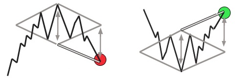 Затем происходит прорыв уровня поддержки и скачок вверх, либо прорыв линии сопротивления и скачок вниз. Колебания могут выйти за очерченный ромб, но, в любом случае, через короткий промежуток времени, относительно периода формирования «Бриллианта», будет скачок и смена тренда. Входить в рынок следует, когда фигура сформирована (когда цена на графике осуществляет пробой линий ромба вниз или вверх).