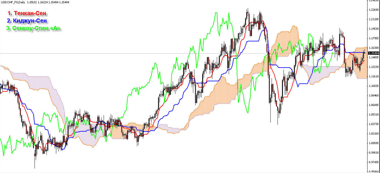 Если рынок находится без движения, тогда местонахождение цены определяется в заштрихованной области индикатора. Если Тенкан-Сен пересекает линию снизу вверх долгосрочной линии Кинджун-Сен, это говорит о том, что трейдер может начинать покупать, и наоборот.
