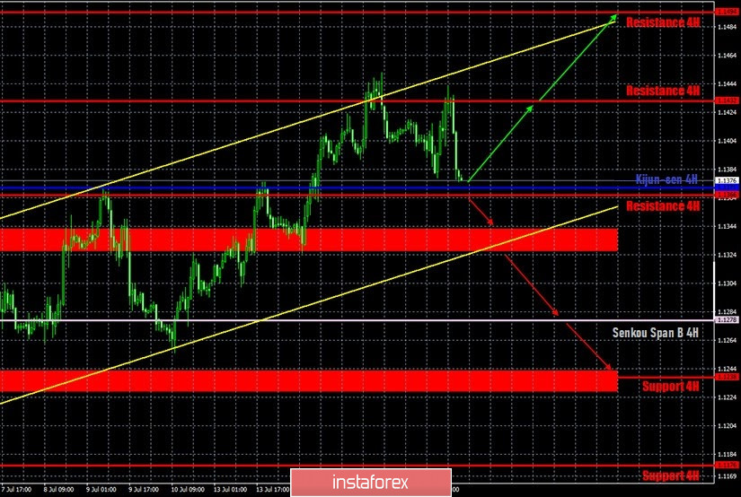The fundamental background for the EUR/USD pair remained the same on Thursday, despite the very loud sign of the day. The summary of the results of the European Central Bank meeting was set on July 16, which is always interesting. However, the key rates remained unchanged, and the volume of the PEPP program remained at the same level, meaning that all the parameters of monetary policy did not change. Therefore, the reaction of market participants was more than restrained. To sum up, the euro rose by 50 points a few hours following the announcement of the results, without particularly changing the technical picture. And the same amount went down a few hours later. Traders only had hope for ECB President Christine Lagarde's speech. Lagarde said during a traditional press conference that the situation in the EU's economy has slightly improved, but the timing and scale of the recovery remain extremely uncertain. "The latest information indicates a resumption of economic activity in the euro area, but its level remains much lower than the values observed before the coronavirus epidemic," Lagarde said. In addition, Lagarde said she expected a greater recovery in economic activity in the third and fourth quarters, as more restrictions were lifted. The ECB chairman still believes that the eurozone needs stimulus measures for a faster and more complete economic recovery. Market participants are advised to closely monitor information coming from the EU summit on the last trading day of the week, if any. The outcome of the negotiations on the recovery fund (which Lagarde mentioned) determines the speed and scale of the EU's economic recovery.
