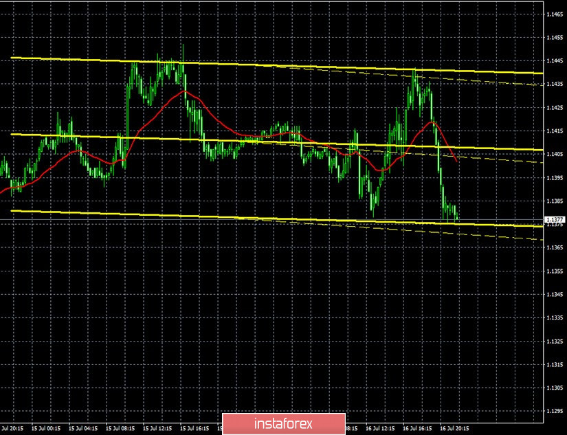 The euro/dollar pair turned around the critical Kijun-sen line on the hourly timeframe on July 16, performed an upward movement to the first resistance level of 1.1432, rebounded from it and returned to the Kijun-sen line, which, at the time of writing, it failed to overcome again. Thus, trading the pair was quite versatile the previous day. Neither the bulls nor the bears had an advantage on Thursday. As such, no buy signal was formed since there was no rebound from the Kijun-sen. But there was a signal to sell – a rebound from the level of 1.1432, but it was not obvious and absolutely counter-trend. Therefore, yesterday was extremely inconvenient for both buyers and sellers. However, the upward channel remains in force, so the trend for the pair remains upward. A rebound from the Kijun-sen line will be a signal to buy.