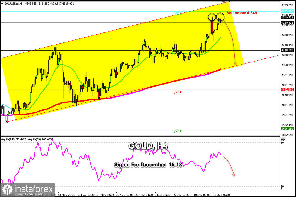 Gold is overbought as seen on the H4 chart, so at current price levels we could sell right now, with targets at $4,300 and $4,280.