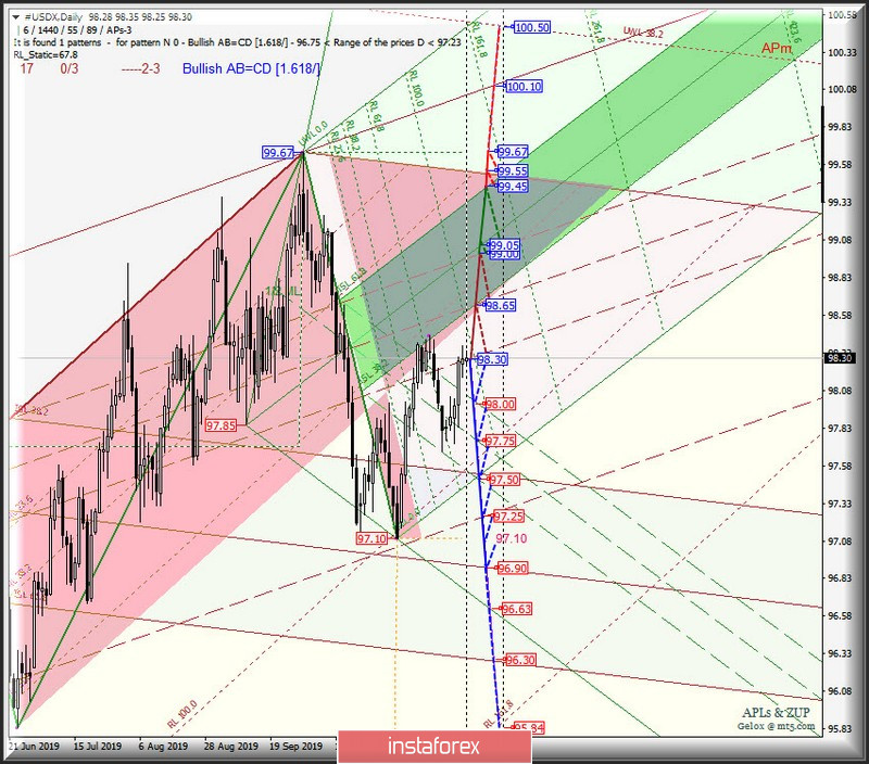 डॉलर सूचकांक माइनर ऑपरेशनल स्केल फोर्क्स के 1/2 मध्यान रेखा चैनल में है, इसलिए, 27 नवंबर, 2019 से #यूएसडीएक्स मूवमेंट का और विकास सीमाओं का टूटना उल्लेखित चैनल (98.30 - 98.65 - 99.00) के विकास और दिशा द्वारा निर्धारित हो जाएगा (98.30)
