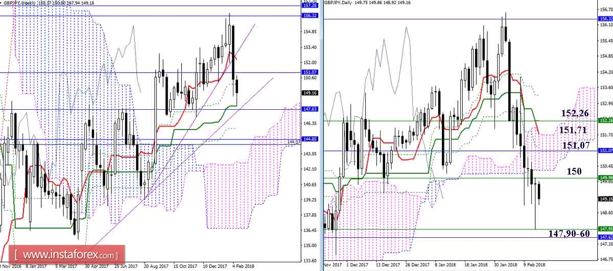 Gli orsi sono andati in diminuzione ieri e hanno testato il settimanale Kijun (147,95). Questo livello di supporto è aumentato rispetto al Tenkan mensile, quindi l'ombra della candela giornaliera era piuttosto impressionante. I giocatori al rialzo ora possono trarre vantaggio da questa circostanza. Le resistenze oggi si può notare nelle aree di 150 (diurno Senkou Span B + settimanale Fibo Kijun) — 151,07 (mensile Kijun) — 151,71 (diurno Tenkan + Senkou Span A) — 152,26 (giornaliero Kijun + settimanale Tenkan).