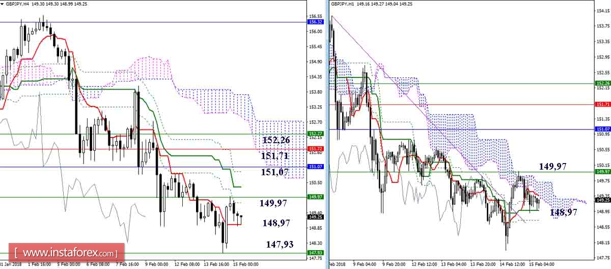 Al momento, i giocatori al rialzo usano il supporto di 148,97 (Tenkan N4 + Kijun N1) per prepararsi a un movimento di correzione verso l'alto completo. Se riescono a mantenere il supporto ora, e poi entrano nella zona rialzista rispetto alla nuvola H1 e procedono con l'eliminazione della croce morta H4, possiamo aspettarci un aumento e una correzione, i cui risultati porteranno i tori a i parametri di riferimento delle intervalli superiori. Importanti punti di resistenza durante l'ascesa si trovano oggi a 149,97 — 151,07 — 151,71 — 152,26.