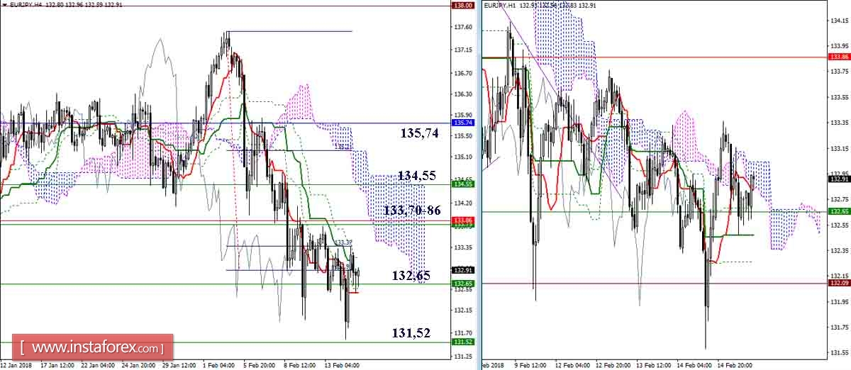 Al momento, i giocatori al rialzo sono impegnati nella liquidazione della croce morta H4, e cercano anche di uscire nella zona del toro rispetto alla nuvola H1. L'implementazione riuscita di questi piani aumenterà il sentimento rialzista e costituirà un obiettivo al rialzo per la rottura della nube H1, indicando la resistenza più importante nella regione della nuvola H4, che è ora rafforzata dai livelli d'intervalli superiori di 133,70-86 e 134,55
