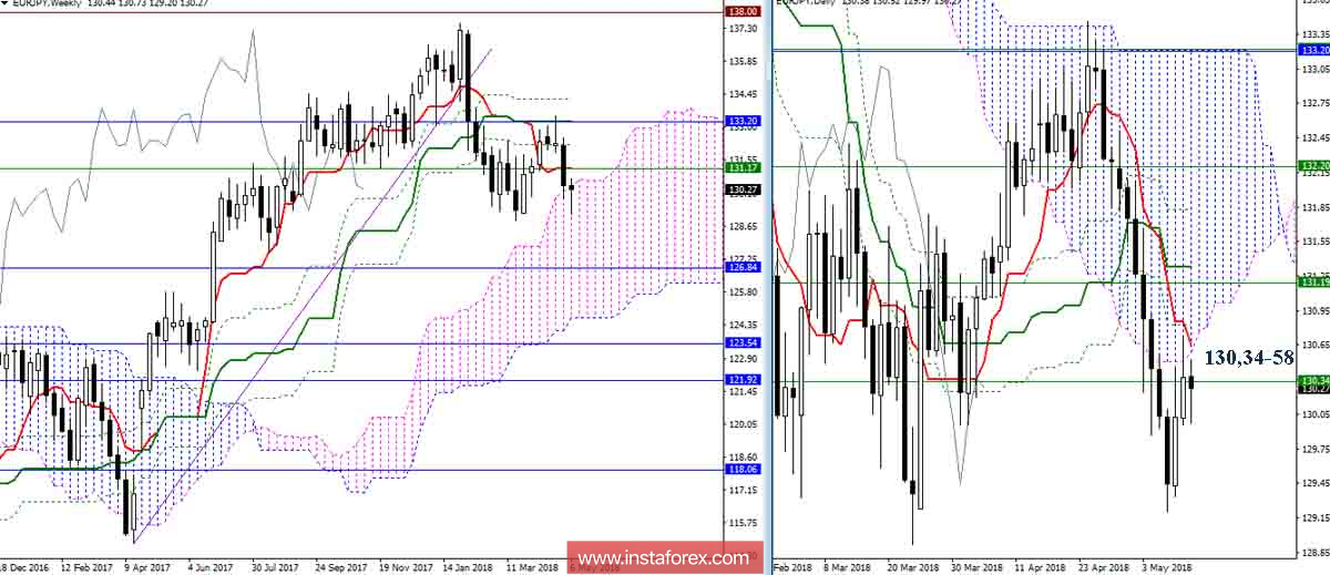 La lotta nell'area dei livelli di resistenza e di attrazione continua. L'area che unisce i confini della nuvola giornaliera e quella settimanale (Senkou Span A delle settimane 130,34 + Senkou Span A dei giorni 130,58) continua a rimanere la zona decisiva, così come il livello 131,19 (Tenkan settimanale + Kijun giornaliero). Il fissaggio sopra creerà i prerequisiti per la formazione di un pullback dal cloud settimanale.