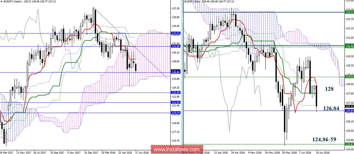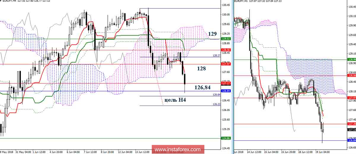 Intervalli di tempo minori confermano che è stata raggiunta una zona di supporto sufficientemente ampia e rafforzata, il supporto per l'intervalli superiori (127,17 – 126,86) + l'obiettivo per la rottura della nube H4 (126,23-64). Di conseguenza, sono necessari forza e tempo per superare questa zona. In questa situazione, se i tori ritornano nelle loro posizioni, potrebbe cambiare l'attuale equilibrio di potere e influenzare l'attuazione di piani al ribasso. Il livello intermedio di resistenza si trova oggi nell'area di 128 (croce H1 + nuvola H1 + Tenkan H4 + Kijun giornaliero), ma il più importante e significativo è il ritorno della linea 129.