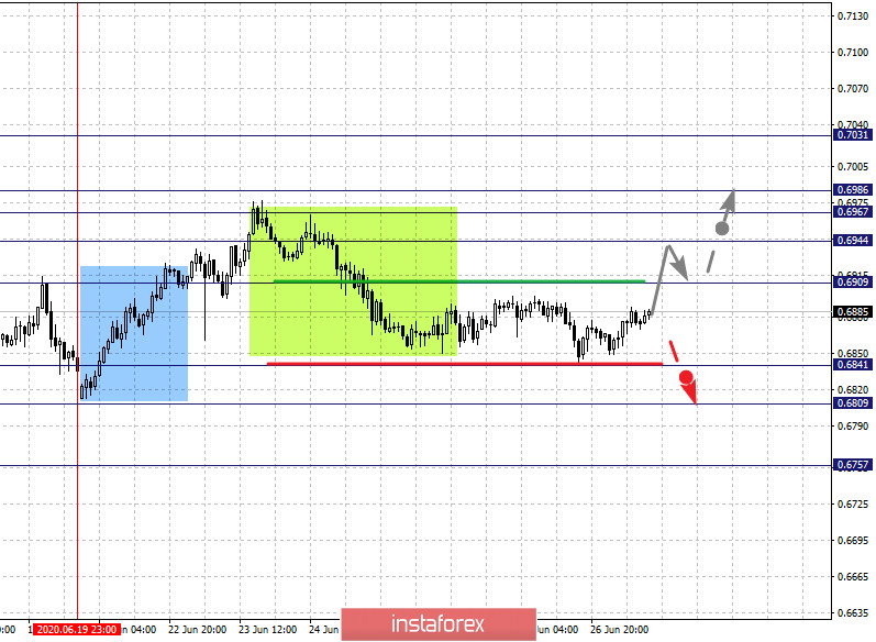 La ripresa dello sviluppo della tendenza al ribasso è possibile dopo la rottura di 0.6840. Il primo obiettivo è 0.6809: la sua rottura dovrebbe essere accompagnata da un pronunciato movimento al ribasso, l'obiettivo potenziale è 0.6757.