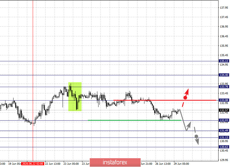 Per la coppia Sterlina/Yen, i livelli fondamentali sul grafico H1 sono: 135.13, 134.40, 133.78, 133.08, 132.02, 131.49, 131.13 e 130.63. Qui prevediamo lo sviluppo del modello discendente dal 23 giugno dopo la rottura di 132.03. In questo caso l'obiettivo è 131.49, nell'intervallo 131.49 - 131.13 c'è il consolidamento dei prezzi. Riteniamo che il livello 130.63 sia un valore potenziale per il bottom; al raggiungimento di questo livello, prevediamo il consolidamento, nonché un pullback al rialzo.