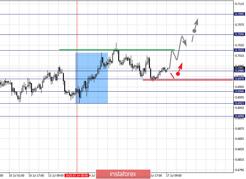 È possibile un movimento al ribasso a breve termine nell'intervallo 0.6986 - 0.6970. La rottura di quest'ultimo valore porterà a una correzione più profonda, l'obiettivo è 0.6946. Questo livello è il supporto chiave per il top. La sua rottura porterà alla cancellazione del modello ascendente del 14 luglio, in questo caso l'obiettivo è 0.6898.