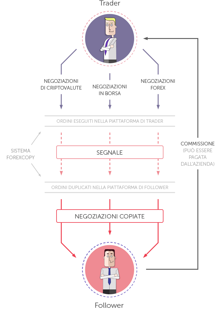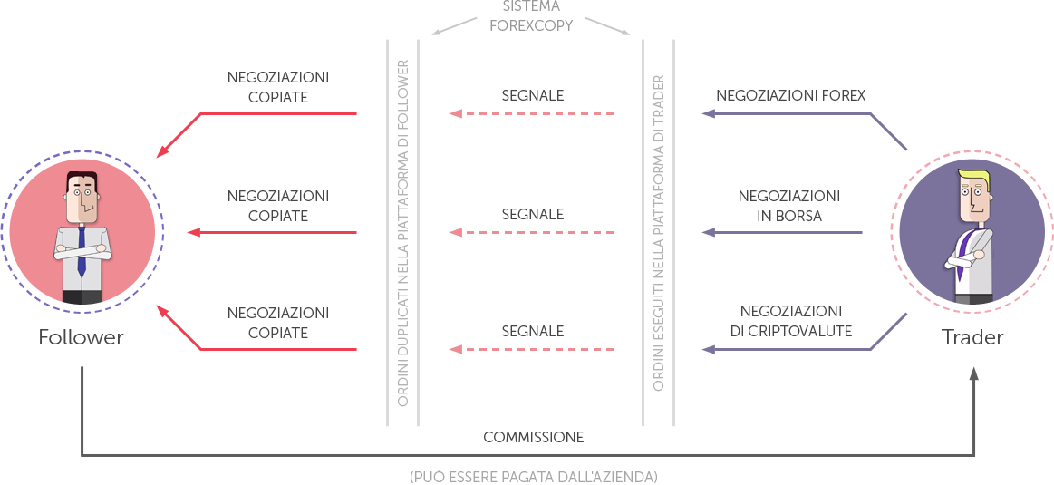 Quando il trader fa il commercio su Forex, le sue operazioni vengono copiate sul conto dell'abbonato in conformità ai parametri specificati. Il pagamento di sottoscrizione dipende dal metodo scelto, sia da addebito sul conto dell'abbonato, sia da accreditamento l'importo necessario nel conto del trader dai fondi della società.