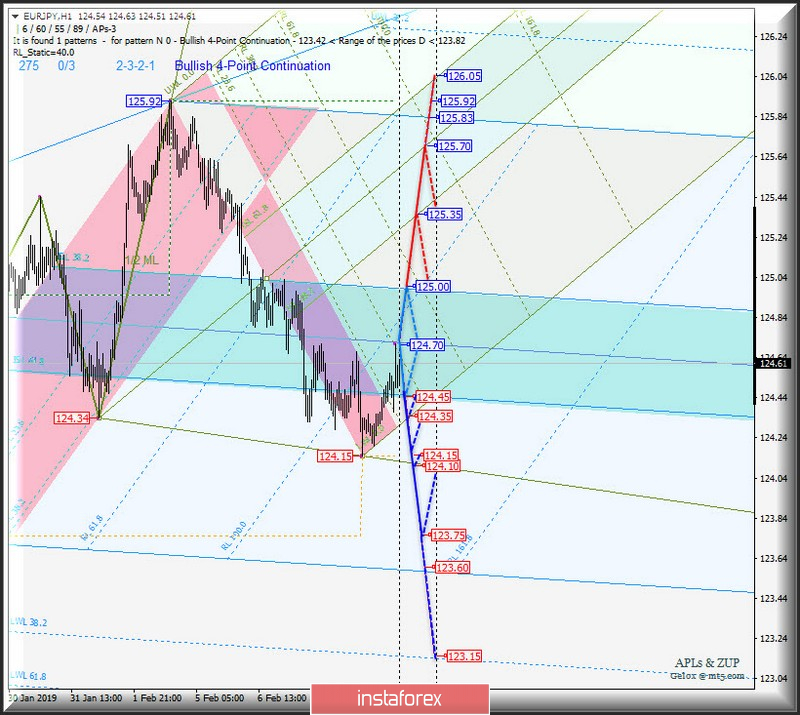 EUR/JPY Minuette операциялық масштаб вилы (125.00 <-> 124.70 <-> 124.45) тепе-теңдік аймағында, тиісінше, осы кросс-аспап қозғалысының 2019 ж. 11 ақпаннан бастап дамуы жоғарыда көрсетілген деңгейлерді пысықтаумен және тесіп өту бағытымен байланысты болады будет.
