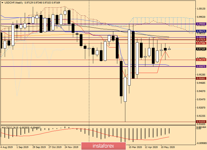 Өткен аптаның сауда қорытындысы бойынша тиісті таймфреймде үлкен төменгі көлеңке және кішкентай аюлы денемен шам пайда болды. Әдетте мұндай шам нарықтың төмендеуі туралы сигнал береді және котировканың келесі өсуін болжайды. Осы жолы қалай болса, ағымдағы апталық сессия жабылғаннан кейін ғана үйренеміз. Қазіргі уақытта жұп 0.9735-ке көтерілді, бірақ шегініп, қазір 0.9718-ге жақын сауда жасайды.