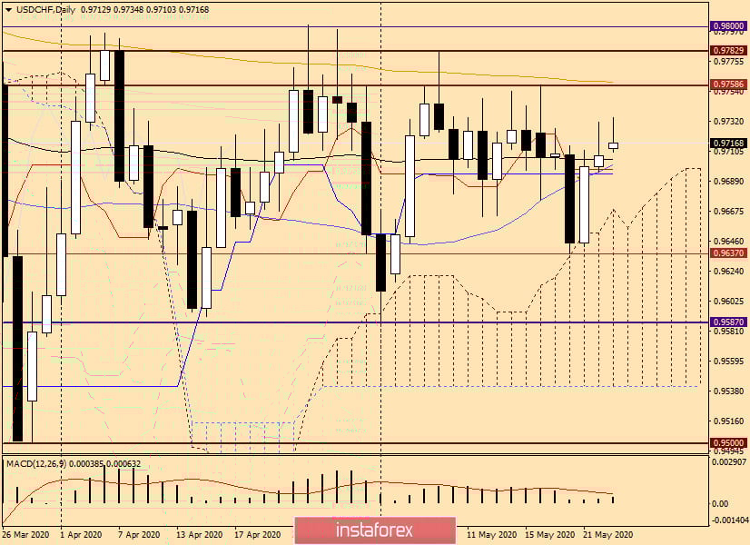 Күндізгі кестеде жағдай шиеленіскен. 21 мамырда жұп Ишимоку бұлтының шегіне түсуге тілек білдірмегеннен кейін, айтарлықтай нығаю көрсетті, өте қиын, бірақ та Киджун, Тенкан, 50 МА және 89 ЕМА еңсеріледі. Шынымды айтсам, бұрын usd/chf жоғарыда аталған кедергілерден жоғары өту мүмкін емес және бағам төмендеу пайда болады деп болжағам. Алайда, бұл әлі орын алған жоқ.