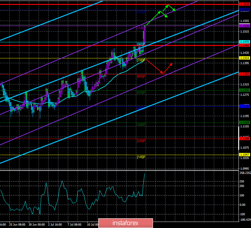 ЕО саммитін аяқтаудан басқа, сейсенбі күні трейдерлердің иелігіне ешқандай маңызды жаңалықтар мен макроэкономикалық есептер түскен жоқ. Шамамен осындай іргелі көрініс сәрсенбі, 22 шілдеде байқалды. Еуро/Доллар жұбы бойынша сауда-саттық сипаты мүлдем өзгерген жоқ екенін ескере отырып, біз әлі де трейдерлер үшін АҚШ-та қалыптасқан жағдай маңызды деп санаймыз. Атап айтқанда саяси, әлеуметтік, эпидемиологиялық және экономикалық дағдарыс. Соңғы Конгресстің үстінде қазіргі уақытта Америка экономикасына кемінде триллион доллар көмек беруге дайын. Алайда, бұл жаңалықтар EUR/USD жұбының кестесінде бір сәттік көрініс таба алмайды. Осылайша, техникалық көрініс қазір маңызды және оған сәйкес өрлемелі тренд қалыптастыру жалғасуда. Сәтсіз және сенімсіз. Бірақ бұқалар еуроны сатып алып, соңғы айларда барлығын сатып алатын валюта мәртебесін жоғалтқан американдық доллардан құтылуда. Сызықтық регрессияның екі арнасы да жоғары бағытталған, сондықтан нарықта қазір кімнің үстемдік етіп жатқанына күмән жоқ.