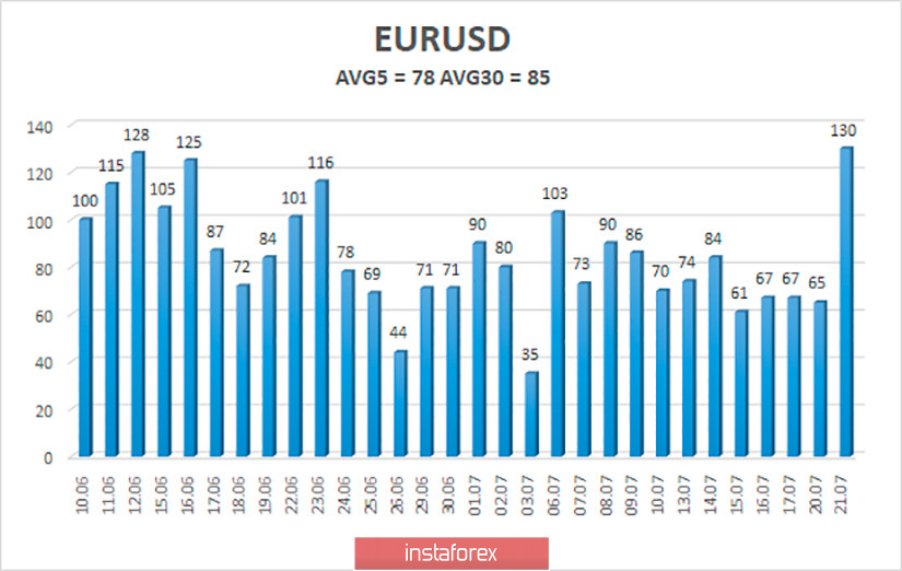 Еуро/доллар валюта жұбының құбылмалылығы 22 шілдеге 78 пункт құрайды және әлі де «орташа» ретінде сипатталады. Осылайша, біз бүгін 1,1462 және 1,1618 деңгейлері арасында жұп қозғалысын күтеміз. Хайкен Аши индикаторының төмен қарай бұрылуы өрлемелі үрдіс шеңберінде төмендейтін түзетудің орамы туралы сигнал береді.