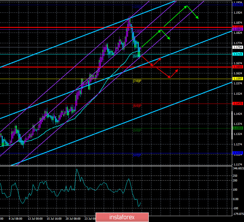 Сейсенбі, 4 тамызда трейдерлердің иелігінде ешқандай маңызды макроэкономикалық ақпарат болмайды. ЕО мен АҚШ үшін Оқиғалар күнтізбесі болсын. Осылайша, трейдерлер сауда-саттықты техникалық факторларға сүйене отырып жүргізеді (біз олар туралы бірінші абзацта айттық), сондай-ақ американдық валютаның пайдасына емес, жалпы іргелі фонға назар аударады. Біз қазіргі уақытта техникалық факторлар күшті деп санаймыз, өйткені сатып алушылар ұзақ позициялар бойынша кірісті белгілей бастады. Сонымен, екі жылдық максимумдарды еуропалық валютаны жаңа сатып алуға мәжбүрлеу үшін өте жақсы себептер қажет болады.