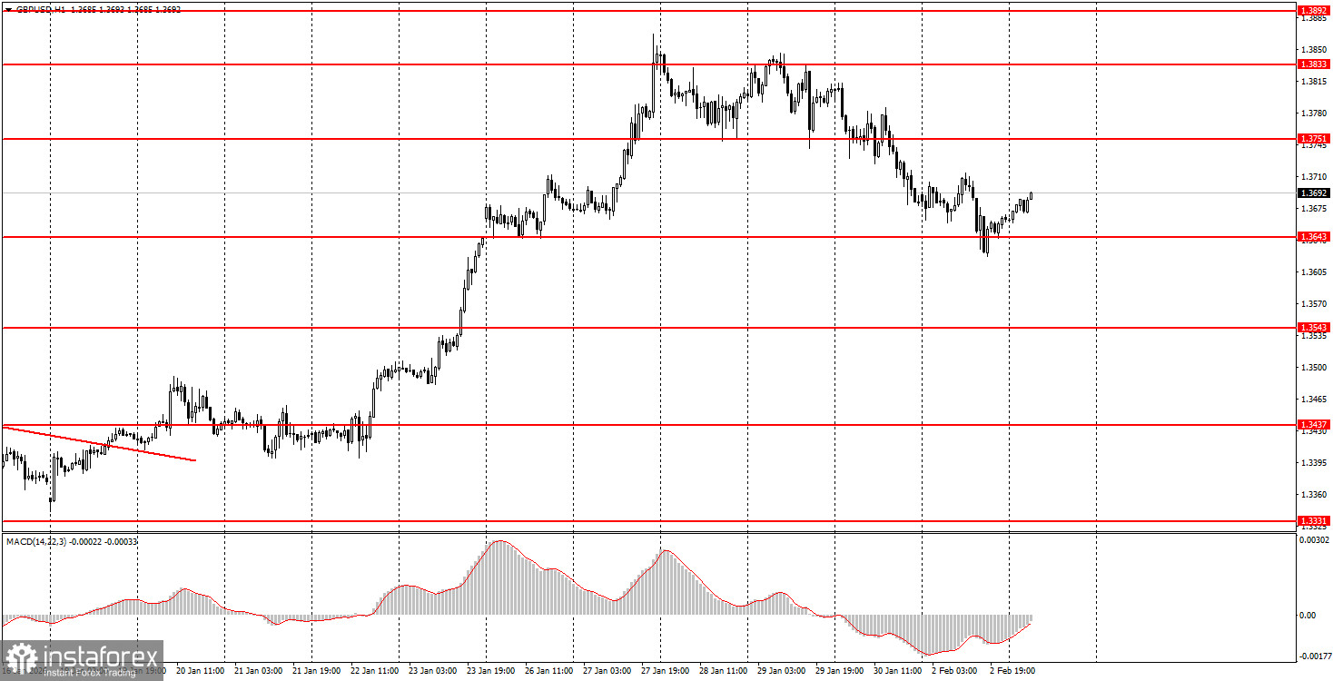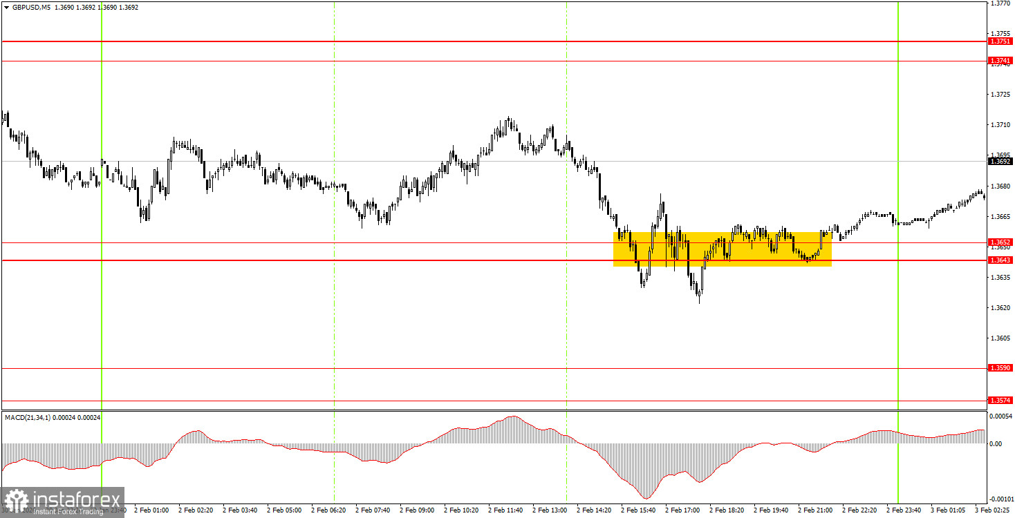 На 5-минутном ТФ в понедельник было сформировано несколько торговых сигналов, но все они оказались ложными. Как только цена достигла область 1,3643-1,3652(которая ранее давала четкую поддержку или сопротивление), начались «песни и пляски». Цена прыгала то вверх, то вниз, поэтому прибыль нельзя было получить по сформированным сигналам. Не самый удачный торговый день, но на рынке случаются и такие.