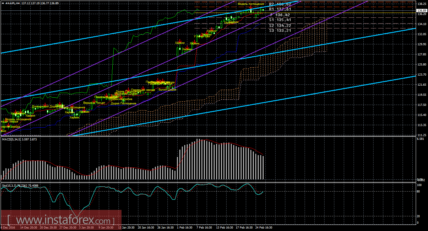 Цена акций Apple продолжает коррекцию. На текущем графике сейчас рекомендуется рассматривать длинные позиции с целью 137,61. В случае преодоления этого уровня, таргетом будет выступать 138,62. Открывать новые ордера на покупку рекомендуется в случае формирования «бычьей» модели (с подтверждением), при отскоке цены от линии Киджун-сен или при развороте индикатора MACD вверх. Стоп лосс при торговле на повышение выставляем ниже критической линии 134,20. Ордера на продажу сейчас не актуальны.