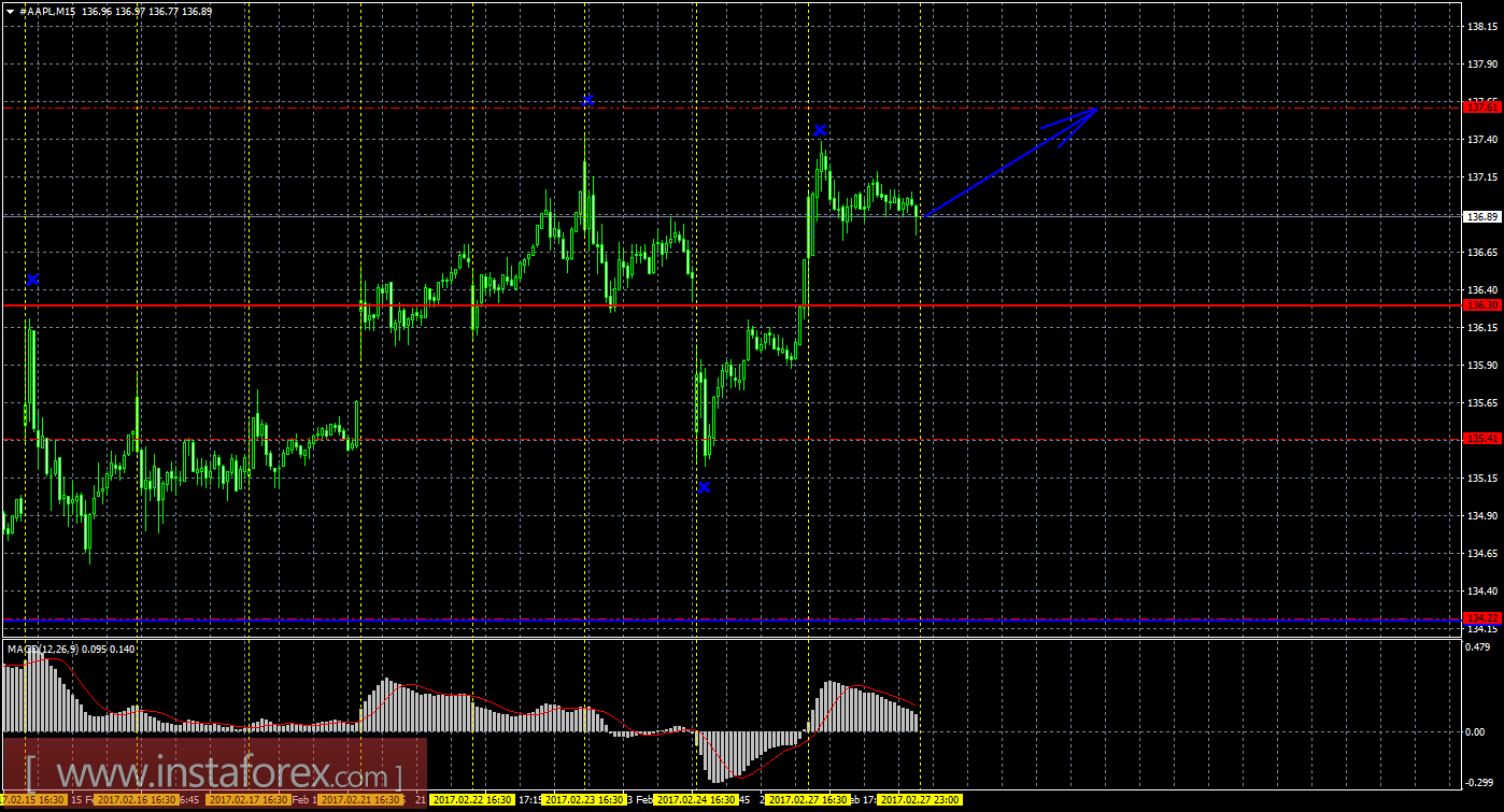 Анализируя акции компании Apple 28 февраля, видим, что цена продолжает корректироваться, так как прошлый верхний фрактал не обновлен. Текущий «золотой крест» является сильным (так как цена располагается выше облака), поэтому длинные позиции индикатор Ишимоку разрешает рассматривать. Старший канал линейной регрессии направлен вверх, младший канал также направлен вверх, поэтому ордера на покупку актуальны и по этому признаку. Целью для восходящего движения инструмента является первый уровень сопротивления 137,61. Второй целью для движения вверх выступает уровень сопротивления 138,62. «Медвежья» модель «Харами» просигнализировала о начале коррекционного движения. MACD по-прежнему направлен вниз, сигнализируя уже о нисходящей коррекции. Разворот индикатора вверх укажет на возможное окончание коррекции, но с реакцией на это индикатор может сильно опоздать. Стохастик покинул область перекупленности, что сейчас свидетельствует о нисходящем настроении участников рынка. Отскок цены от критической линии может спровоцировать возобновление восходящего тренда. Младший таймфрейм детализирует картину старшего таймфрейма. На младшем графике также видно, что цена по-прежнему располагается выше линии Тенкан-сен, однако, коррекция может возобновиться, так как последний верхний фрактал ниже предыдущего. Лонги сейчас сохраняют свою актуальность с целью уровень сопротивления 137,61, а разворот индикатора MACD вверх укажет на окончание витка локальной коррекции.