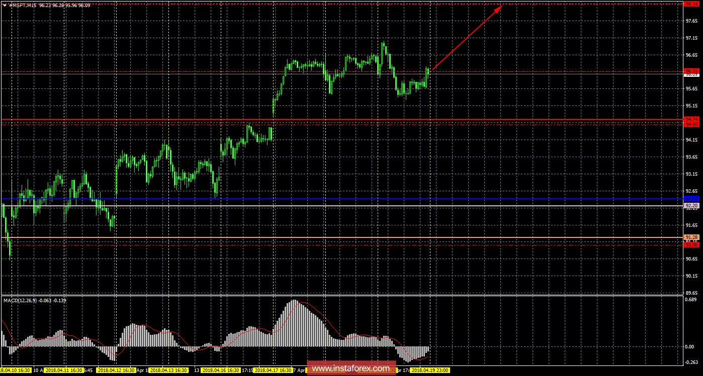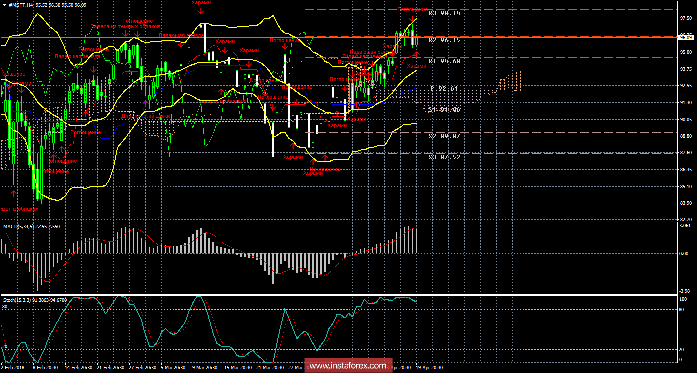 Акции компании Microsoft на торговой сессии в четверг, 19 апреля, также начали нисходящую коррекцию. Новых интересных сообщений от компании за минувшие сутки не поступало. C технической точки зрения продолжает отрабатываться «золотой крест», который является сильным, так как цена располагается выше облака Ишимоку. Таким образом, лонги сейчас являются актуальными, а целью для движения вверх выступает третий уровень сопротивления 98,14. Полосы Боллинджера направлены наверх и немного расширяются, что свидетельствует о восходящей тенденции по инструменту. Сформировалась медвежья модель «Поглощение», которая указала на начало коррекции. Еще одна новая модель бычья «Харами», указывает на возможное завершение коррекции, но не имеет подтверждения. Разворот индикатора MACD вниз подтвердил начало нисходящей коррекции. На 15-минутном таймфрейме видно, что цена закрепилась ниже уровня 96,15. Движение вверх, таким образом, может возобновиться с целью уровень сопротивления 98,14, если цена вновь преодолеет 96,15. Последний верхний фрактал был обновлен, поэтому в целом больше шансов на продолжение восходящего движения.