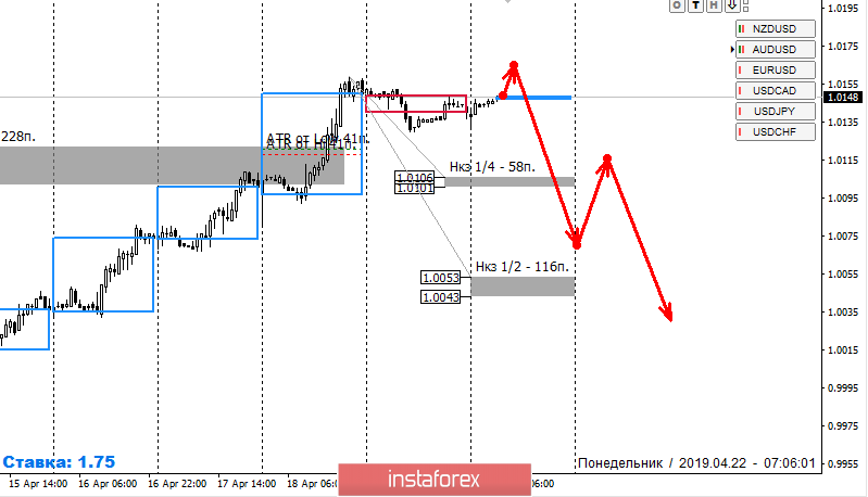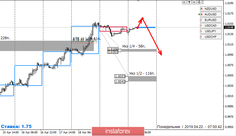 Восходящее движение текущего месяца является сильным бычьим импульсом, однако в конце прошлой недели пара достигла месячной КЗ. Это увеличивает вероятность остановки роста и появления крупного предложения. Не стоит забывать, что закрытие прошлой недели произошло за пределами среднего хода, что увеличивает вероятность формирования нисходящего коррекционного движения до 90%. Для продажи инструмента требуется формирование паттерна "ложного пробоя" при ретесте максимума прошлой недели.