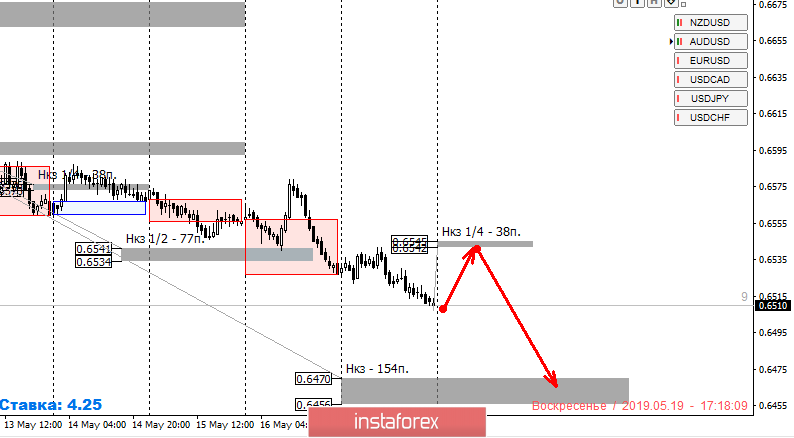 Нисходящее движение является среднесрочным импульсом, поэтому продажи остаются приоритетными. С текущих отметок продавать в понедельник не выгодно, так как целью падения является недельная КЗ 0.6470-0.6456. Любой рост необходимо использовать как возможность продать пару. Первым сопротивлением будет НКЗ 1/4 06545-0.6542.