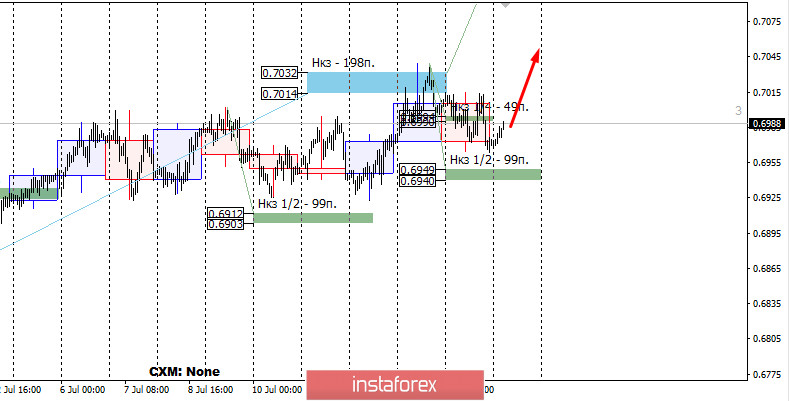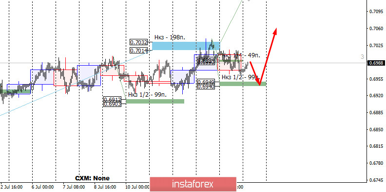 Для получение более выгодных цен на покупку инструмента потребуется тест НКЗ 1/2 0.6949-0.6940. Если это произойдет, то для входа потребуется формирование любого паттерна "поглощение" на таймфрейме не ниже м30. Для нарушения восходящей модели необходимо закрытие сегодняшних торгов ниже НКЗ 1/2. Это позволит выйти из всех длинных позиций и рассматривать продажи уже в понедельник.