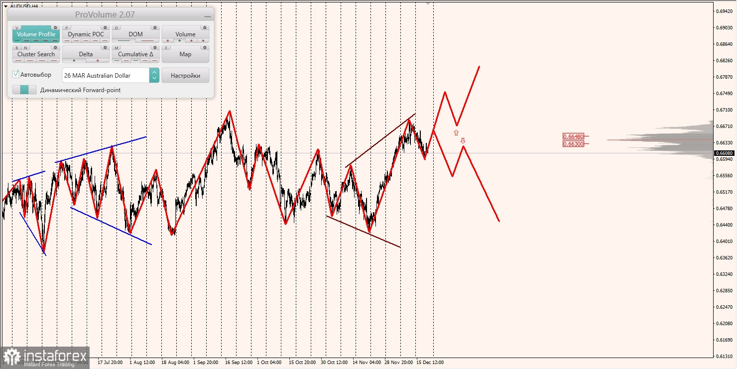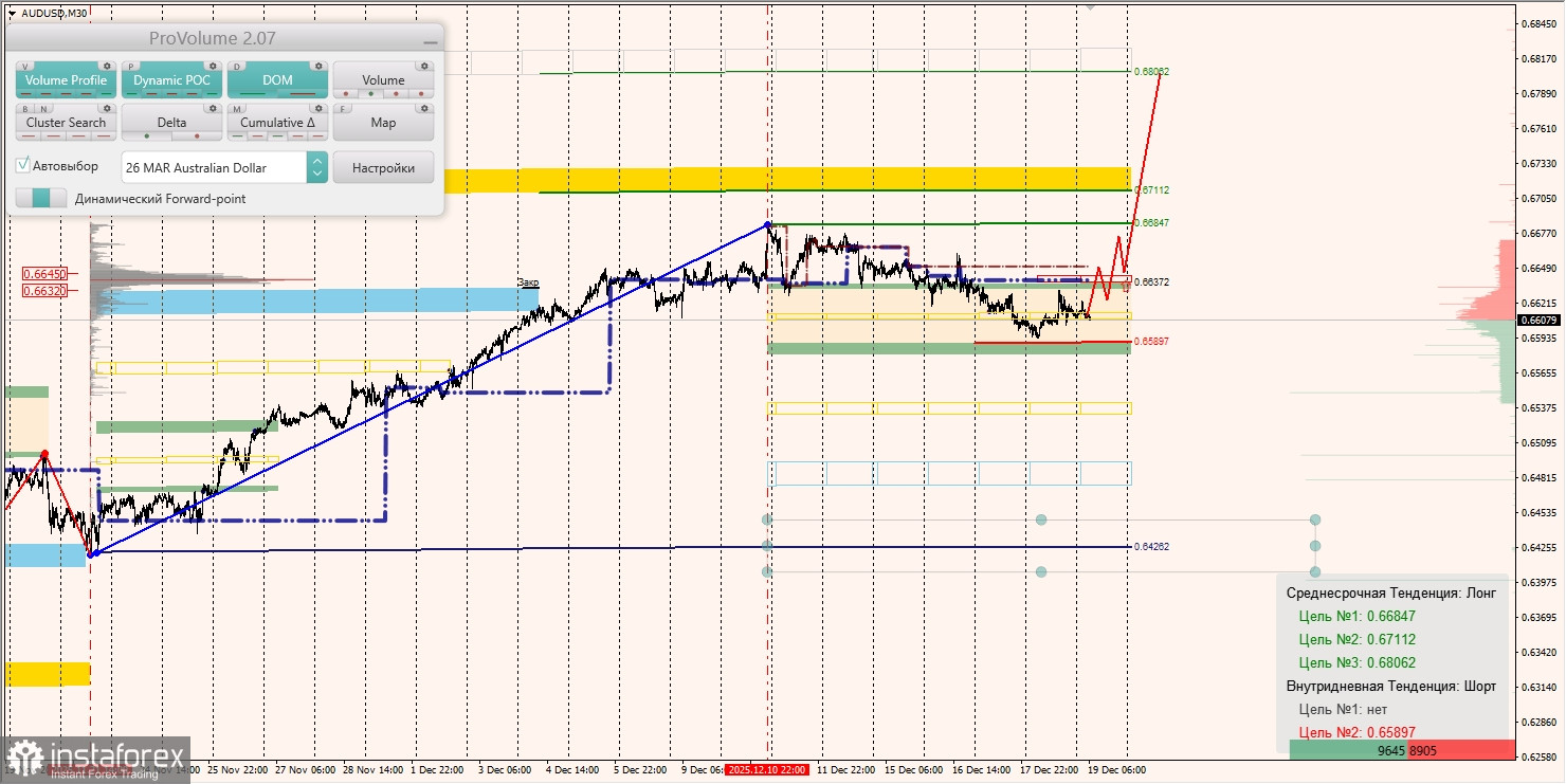 Среднесрочная тенденция: в лонг. Максимальное скопление объемов среднесрочной тенденции расположено в диапазоне, по котировкам 0.66320-0.66450. В настоящий момент по паре совершаются инвестиционные операции ниже указанного диапазона, что говорит о слабости покупателей.