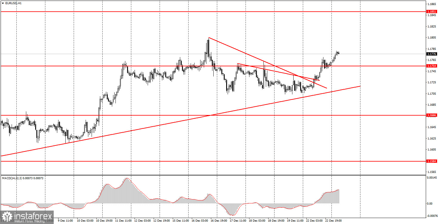 Валютная пара EUR/USD в понедельник неожиданно начала рост. Неожиданно с фундаментальной и макроэкономической точки зрения, а также принимая во внимание тот факт, что началась рождественская неделя. В понедельник в Евросоюзе и США не было запланировано ни одного важного события или публикации, тем не менее, европейская валюта подорожала на 70 пунктов. Для нас любой рост пары EUR/USD априори является логичным. Более того, мы предупреждали, что в условиях «тонкого» рынка волатильное, трендовое движение даже более вероятно, чем в последние недели и месяцы, так как двигать цену становится легче. С технической точки зрения, пара еще утром закрепилась выше двух нисходящих линий тренда, сохранив при этом актуальность длительной восходящей линии тренда. Таким образом, начинающие трейдеры вполне могли открывать длинные позиции в самом начале движения. Пара вновь подбирается к верхней линии бокового канала 1,1400-1,1830 на дневном ТФ и имеет все шансы на этот раз ее преодолеть. Мы вполне допускаем, что завершение шестимесячного флэта придется на Рождество и Новый год.