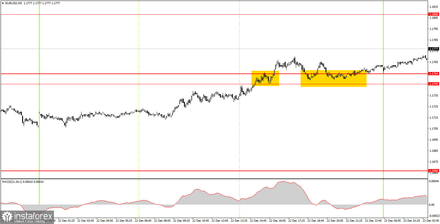 На 5-минутном ТФ в понедельник было сформировано два торговых сигнала на покупку. Сначала пара преодолела область 1,1745-1,1754, а затем отскочила от нее сверху. Таким образом, начинающие трейдеры могли открывать еще одну длинную позицию, если не успели в первый раз, по сигналу на часовом ТФ.