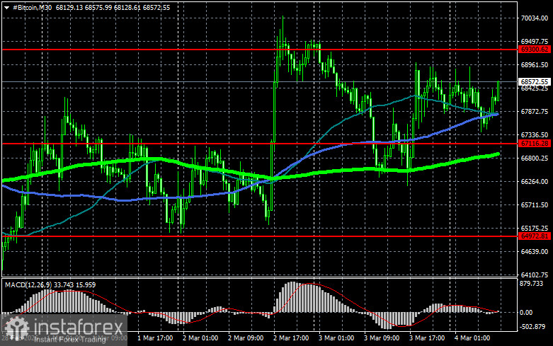 Что касается технической картины Bitcoin, то покупатели сейчас нацелены на возврат уровня $69 300, который открывает прямую дорогу на $71 300, а там уже и рукой подать до уровня 74 600. Самой дальней целью выступит максимум в районе $77 600, преодоление которого будет означать попытки возврата бычьего рынка. В случае падения биткоина покупателей жду на уровне $67 100. Возврат торгового инструмента под эту область может быстро свалить BTC в район $64 900. Самой дальней целью будет область $62 600.