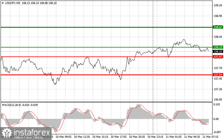 Сценарий №2: продавать USD/JPY сегодня также планирую в случае двух подряд тестов цены 158.19 в момент, когда индикатор MACD будет находиться в области перекупленности. Это ограничит восходящий потенциал пары и приведет к обратному развороту рынка вниз. Можно ожидать снижения к противоположному уровню 157.97 и 157.54.