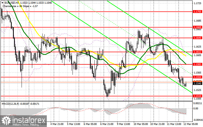 Продавцы вернули контроль над рынком, так как, по всей видимости, заявления Трампа по Ближнему востоку больше не работают и не успокаивают. В настоящий момент задачей медведей является защита ближайшего сопротивления 1.1554. Только формирование там ложного пробоя даст точку входа в короткие позиции с целью движения к поддержке 1.1510 – месячному минимуму. А вот прорыв и закрепление ниже этого диапазона, а также обратный тест снизу вверх, позволят добиться более крупной распродажи евро. Это приведет к дополнительному варианту на открытие коротких позиций с движением в район 1.1472. Самой дальней целью выступит область 1.1433, где буду фиксировать прибыль. В случае движения вверх EUR/USD, а также отсутствия активных действий медведей в районе 1.1554, евро получит шанс на небольшое восстановление. В таком случае короткие позиции лучше всего отложить до более крупного уровня 1.1583, где проходят средние скользящие, играющие на стороне медведей. Продавать там будут только после неудачного закрепления. Открывать короткие позиции сразу на отскок я планирую от 1.1612 с целью нисходящей коррекции в 30-35 пунктов.