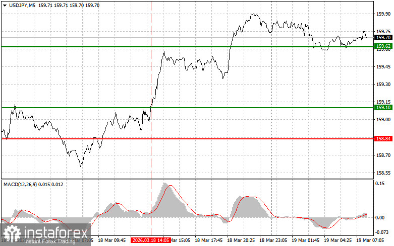 Сценарий №2: покупать USD/JPY сегодня также планирую в случае двух подряд тестов цены 159.59 в момент, когда индикатор MACD будет находиться в области перепроданности. Это ограничит нисходящий потенциал пары и приведет к обратному развороту рынка вверх. Можно ожидать рост к противоположным уровням 159.77 и 160.10.