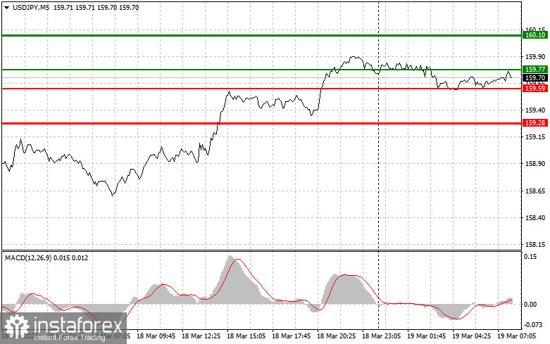 Сценарий №2: продавать USD/JPY сегодня также планирую в случае двух подряд тестов цены 159.77 в момент, когда индикатор MACD будет находиться в области перекупленности. Это ограничит восходящий потенциал пары и приведет к обратному развороту рынка вниз. Можно ожидать снижения к противоположному уровню 159.59 и 159.28.