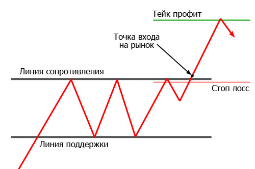 Аввалги ҳаракат йўналишида нархнинг ёриб ўтиши жуда кўп ҳолларда бўлиб ўтади. Шунинг учун график моделга давом эттириш фигураларига тегишли деб қаралади. Амалиётда нарх фигурани аввалги трендга нисбатан тескари томонга ҳам ёриб ўтиши ва юриши ҳоллари бор. Шундай қилиб, "Тўртбурчак" бурилиш фигураси бўлиб қолади. Бу таҳлилчиларнинг прогнозларини оқламаган макроиқтисодий маълумотларнинг чиқишидан сўнг бўлиб ўтиши мумкин.