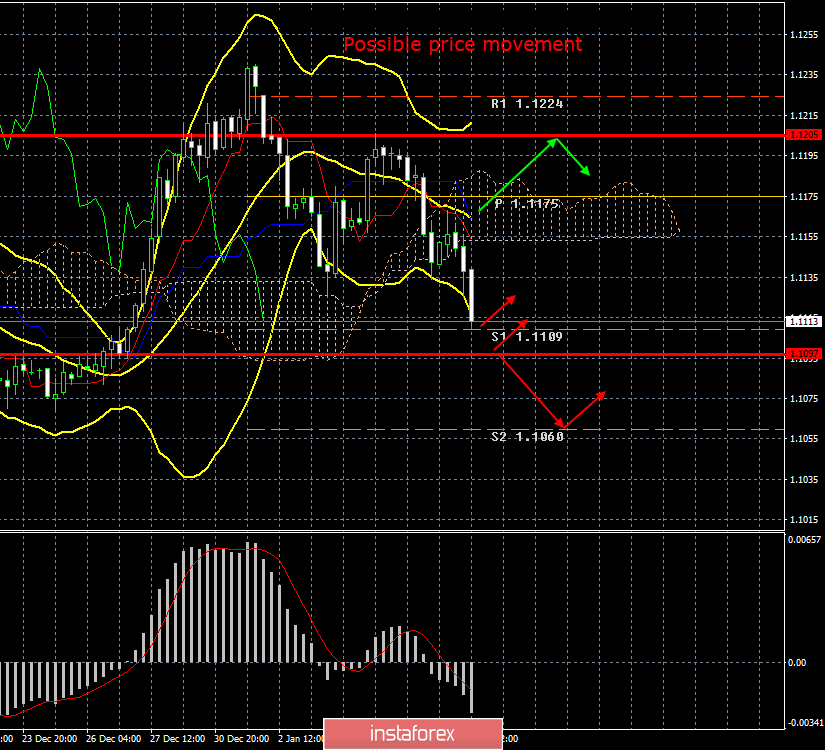 Thus, we expect the downward movement to continue this week. A few more critical macroeconomic publications will take place on Friday. We are talking about NonFarm Payrolls in the United States, about changing the average hourly wage and unemployment rate. All three reports are critical to the US economy. The technical picture is now absolutely clear. The price consolidated below the Ichimoku cloud, so the current signal for selling the Dead Cross has strengthened. The pair has almost reached the first support level of 1.1109 and may rebound from it or the lower boundary of the volatility channel on January 8 - 1.1097. Thus, a new round of upward correction may begin today or tomorrow.