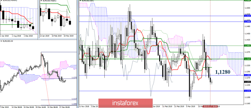 Wczoraj para kontynuowała spadek. W wyniku punktami orientacyjnymi są teraz 1,1216 (miesięczny Senkou Span A) - 1176 (minimalne ekstremum) - 1,1092-1,127 (cel H4). Przy zmianie nastrojów najbliższy znaczący opór znajduje się na 1,1280 (miesięczny Fib Kijun), następnie 1,1312 (Daily Kijun) i 1.1345 (tygodniowy Tenkan + dzienny Tenkan + chmura dzienna).