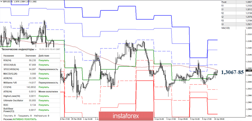 Para przetestowała opór 1,3120 (dzienne Fibo Kijun) i powróciła do strefy wpływu poziomów 1.3078 - 1.3020. Zgodnie z wcześniejszymi oczekiwaniami, szeroki zakres różnorodnych poziomów wsparcia i oporu powstrzyma rozwój. Strefa jest utworzona przez linie wskaźnika Ichimoku o różnych przedziałach czasowych, które zdołały zająć pozycję poziomą i teraz zakłócają aktywne działania różnych sił. Zmiana sytuacji może pomóc wyjść poza najważniejsze granice - 1,3248 dla byków i 1,29 dla niedźwiedzi.Wczoraj graczom na wzrost nie udało się utrzymać cotygodniowego trendu długoterminowego, ale oni nie pozostawiają nadziei, więc dziś ten poziom jest ponownie testowany (1.3085). Obecnie pojednanie 1.3067-85 (centralny poziom Pivot + tygodniowy trend długoterminowy) jest obszarem niepewności, strefą zmian obecnego bilansu sił. Ustalenie powyżej przywróci aktualność w ciągu dnia do oporów klasycznych poziomów Pivot (1.3103-58-94), ustalenie poniżej otworzy drogę ku wsparciom 1.3012 - 1.2976 -1.2921.