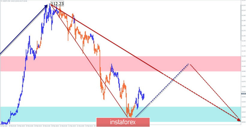 W krótkim okresie kierunek japońskiego jena wyznacza bycza fala z 5 sierpnia. Do 20 lutego cena osiągnęła dolnej granicy wstępnej strefy zakończenia. Potem następuje gwałtowny spadek kursu. Obszar niedźwiedzi ma potencjał odwrócenia.