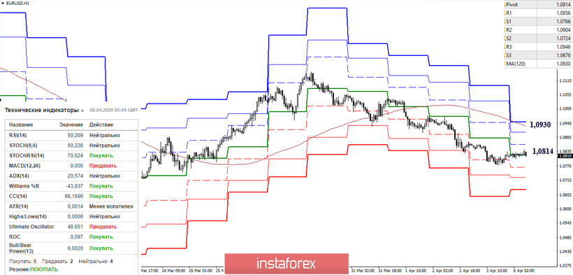 Przerwa, którą gracze podjęli w celu zwiększenia na koniec marca, doprowadziła do dość głębokiego spadku, ale niedźwiedzie nie zdołały całkowicie wyrównać sił byków i osiągnąć przewagi. W tej chwili osiągnięto wsparcie dla historycznego poziomu 1.0778, a następnie wśród niedźwiedzi przełomowych możemy wskazać cel rozpadu chmury H4 (1.0726 - 1.0679), minimum ekstremalne z marca (1.0636) i poziom 100% wypracowania tygodniowego celu rozpadu chmury Ichimoku (1.0595). Możliwe jest teraz hamowanie i długie zatrzymanie na dowolnym z wymienionych punktów wsparcia. Siły, które w marcu utworzyły o wiele niższy cień, będą teraz walczyć o utrzymanie niepewności i pewnej parytetu, próbując powstrzymać aktywność niedźwiedzi na dużą skalę. Główny opór związany z otwarciem nowego tygodnia pozostał na miejscu. Dziś najbliższe z nich można zidentyfikować na 1,0879 - 1,0965 - 1,1009 - 1,1067 - 1,1100.