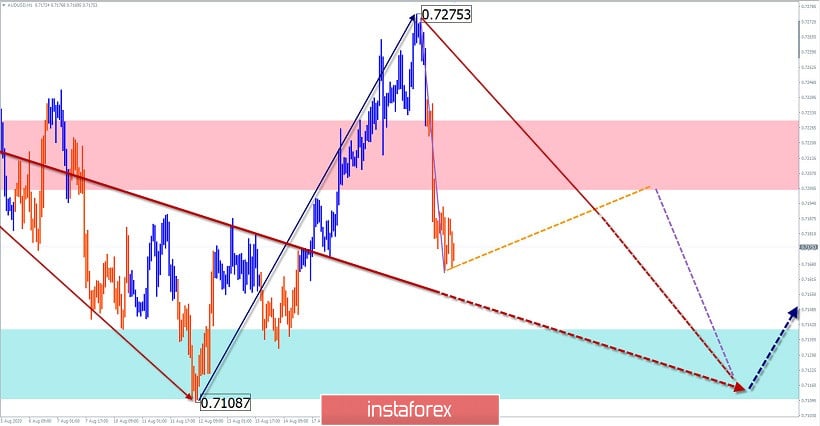 Na wykresie dolara australijskiego od marca bieżącego roku rozwija się fala wzrostowa, wyznaczając trend. Skala ruchu już przekracza poziom dziennych ram czasowych. Notowania znajdują się teraz w obszarze strefy odwrócenia, tworząc korektę, która ma kształt płaszczyzny ścinającej i zbliża się do końca.