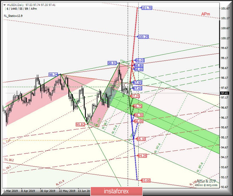 A partir de 13 de agosto de 2019, o desenvolvimento do movimento do índice do dólar # USD será determinado pelo desenvolvimento e pela direção da quebra dos limites do canal da Linha Mediana 1/2 (97,95 - 97,65 - 97,25) do Minuette. Fork de escala operacional. Nós olhamos para os gráficos de movimento dentro deste canal no gráfico de animação.