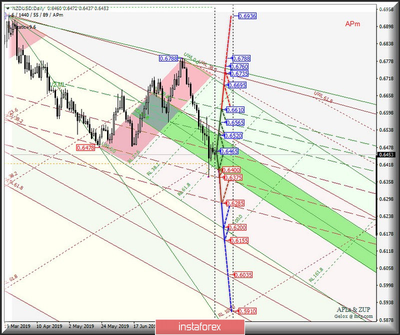O desenvolvimento e a direção da divisão dos limites da zona de equilíbrio (0,6520 - 0,6465 - 0,6400) da escala operacional Minuette determinará o desenvolvimento do movimento do dólar neozelandês / dólar americano (NZD / USD) em agosto de 2019. As marcações de movimento no canal da linha Mediana 1/2 são indicadas no gráfico de animação.