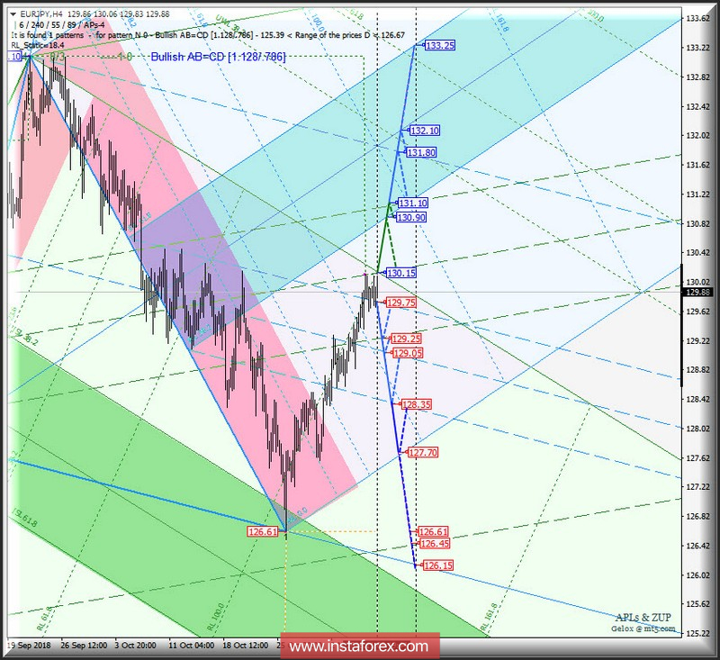 Пробой уровня сопротивления 130.15 (1/2 Median Line Minute) -> вариант продолжения развития восходящего движения EUR/JPY к целям -> нижняя граница ISL38.2 (130.90) зоны равновесия вил операционного масштаба Minuette <-> верхняя граница канала 1/2 Median Line (131.10) вил операционного масштаба Minute <-> конечная Shiff Line Minuette (131.80) <-> срединная линия Median Line Minuette (132.10).