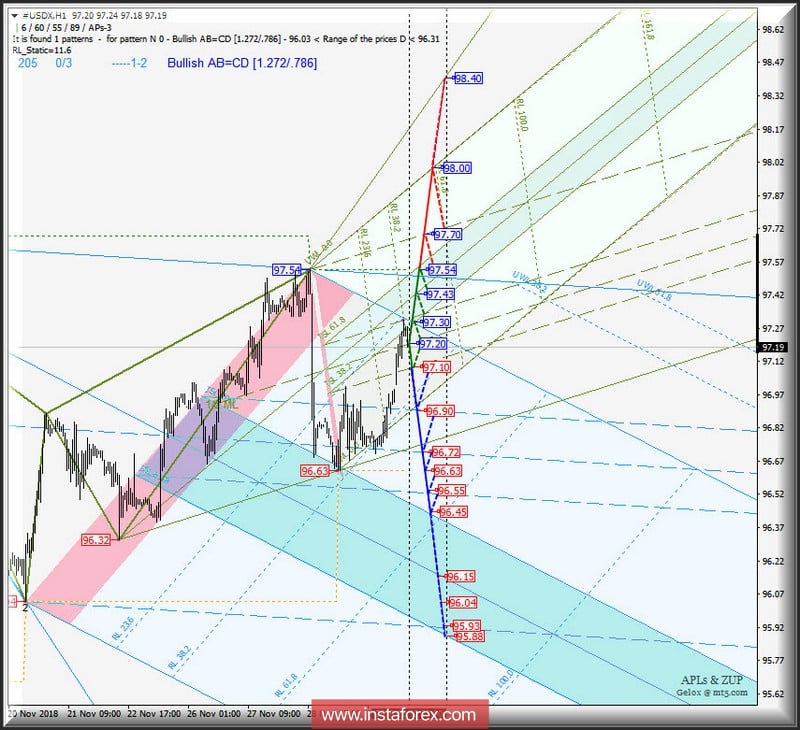 Развитие движения индекса доллара #USDX в ближайшие семь дней 03.12_10.12.2018 г. будет определено направлением пробоя границ канала 1/2 Median Line (97.10 <-> 97.20 <-> 97.30) вил операционного масштаба Minuette.