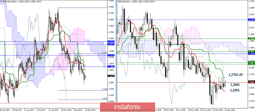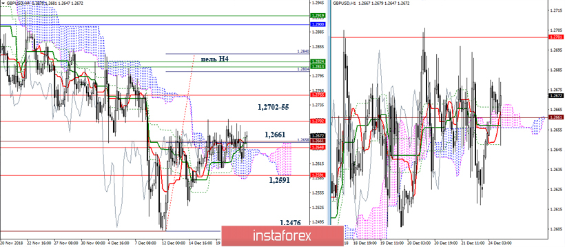 Ситуация с момента последнего анализа практически не изменилась. Пара продолжает упираться в облако Н4 и уровень 1,2661. В результате выводы и ожидания сохранятся. Отрыв от облака Н4 и преодоление промежуточных сопротивлений (1,2702-55) позволит исполнить цель на пробой облака Н4 и протестировать недельные уровни (1,1814-25). Закрепление под облаком Н4 и потеря дневного краткосрочного преимущества (1,2591) вернёт преимущества на сторону игроков на понижение, основной задачей при этом станет выход из зоны коррекции (1,2476) и восстановление нисходящего тренда.