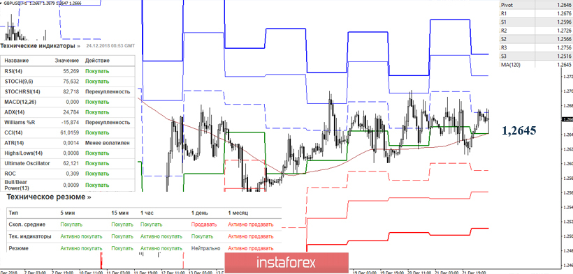 Ключевая поддержка сегодня расположена на 1,2645 (центральный Пивот-уровень + МА (120)). Пара сейчас находится выше данного уровня, значит начальное преимущество в настоящий момент на стороне игроков на повышение. Индикаторный анализ большинством голосов также поддерживает в текущей ситуации усиление бычьих настроений. Следующими повышательными ориентирами сегодня служат R2 (1,2726) и R3 (1,2756). Потеря уровня 1,2645 может изменить данную картину, отдав предпочтение игрокам на понижение. Ориентирами для снижения в этом случае станут S1 (1,2596), S2 (1,2566), S3 (1,2516).